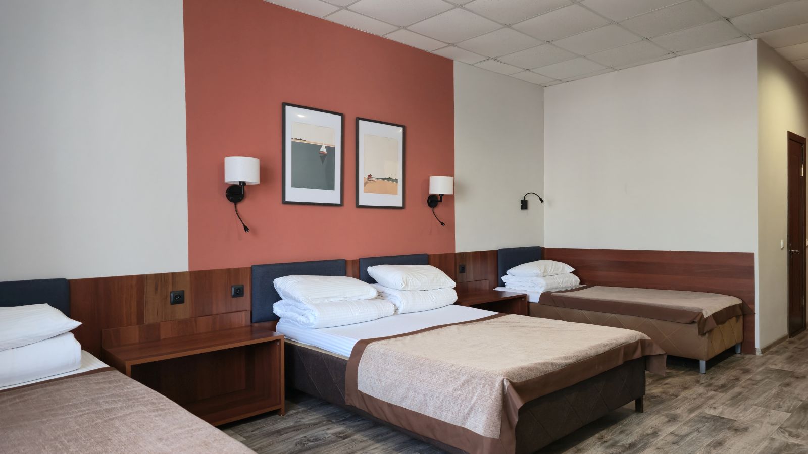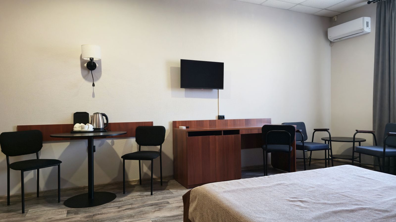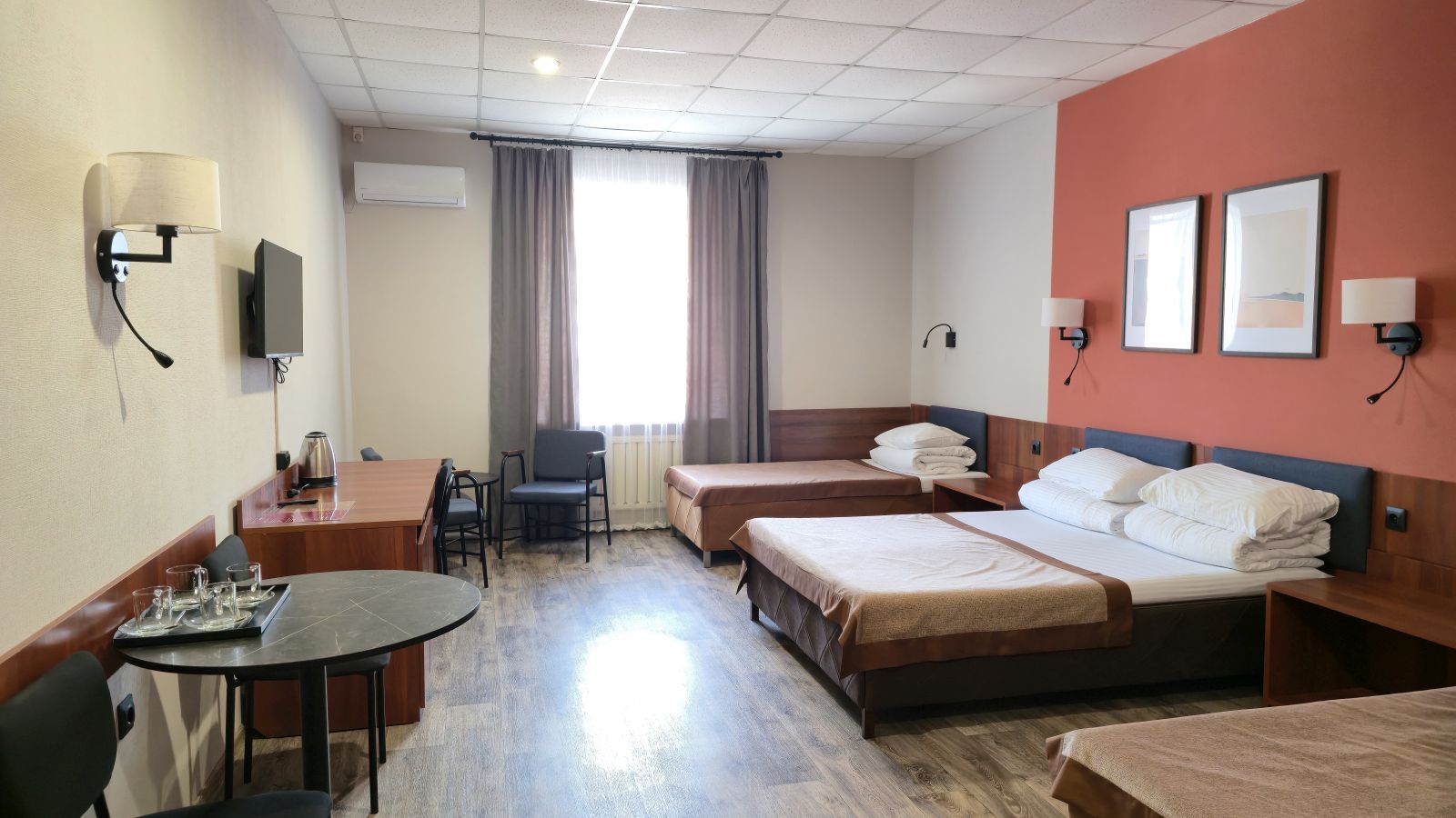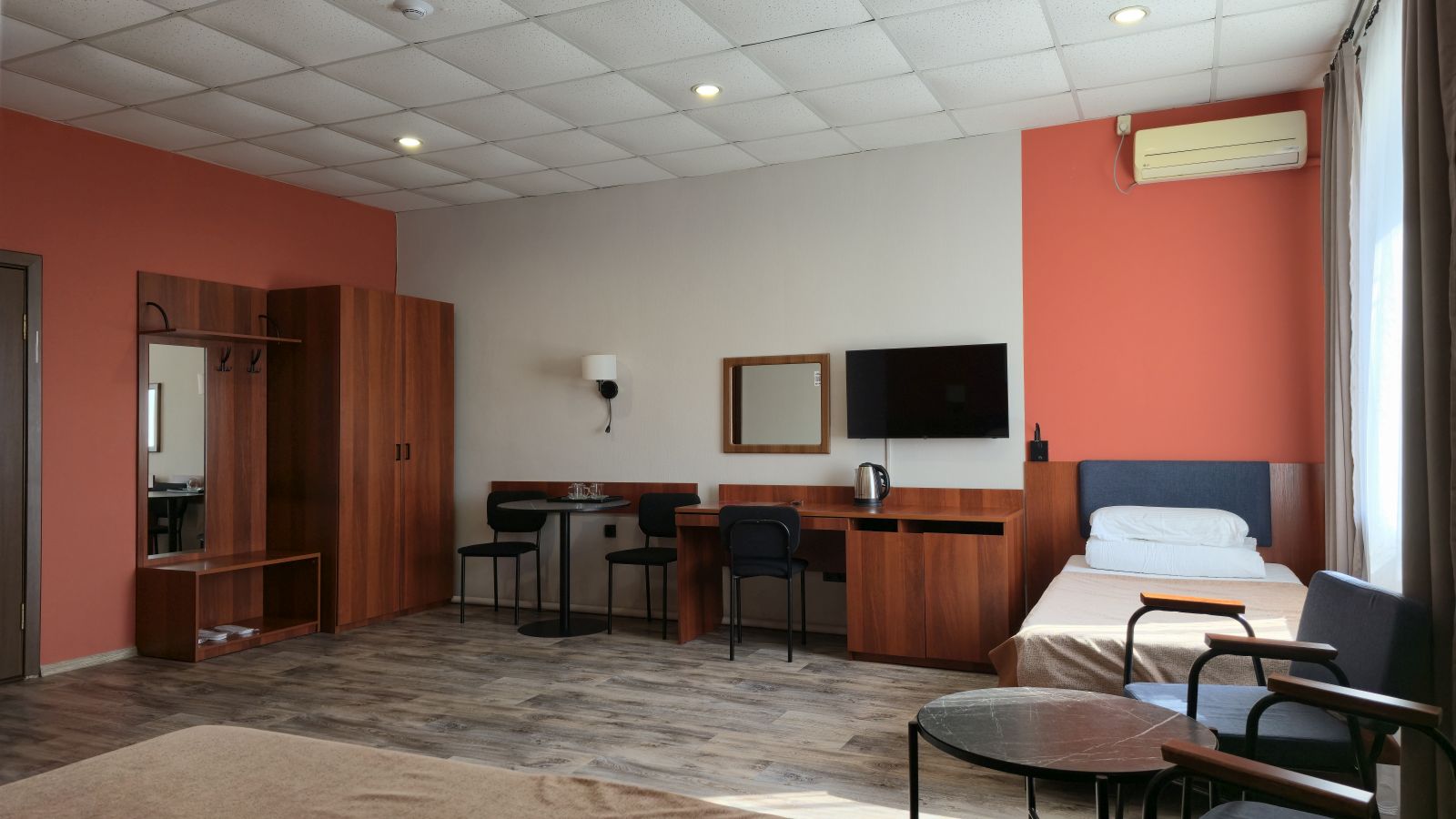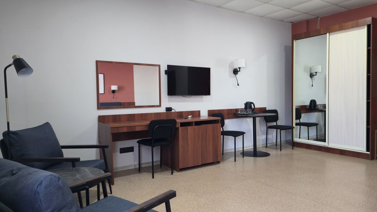 Просторный уютный семейный улучшенный номер (36 кв. м.) для пар с детьми; отдельная ванная комната, телевизор, обеденный стол, холодильник, чайник, кондиционер. Проведено кабельное телевидение, установлено оборудование беспроводного доступа в интернет.